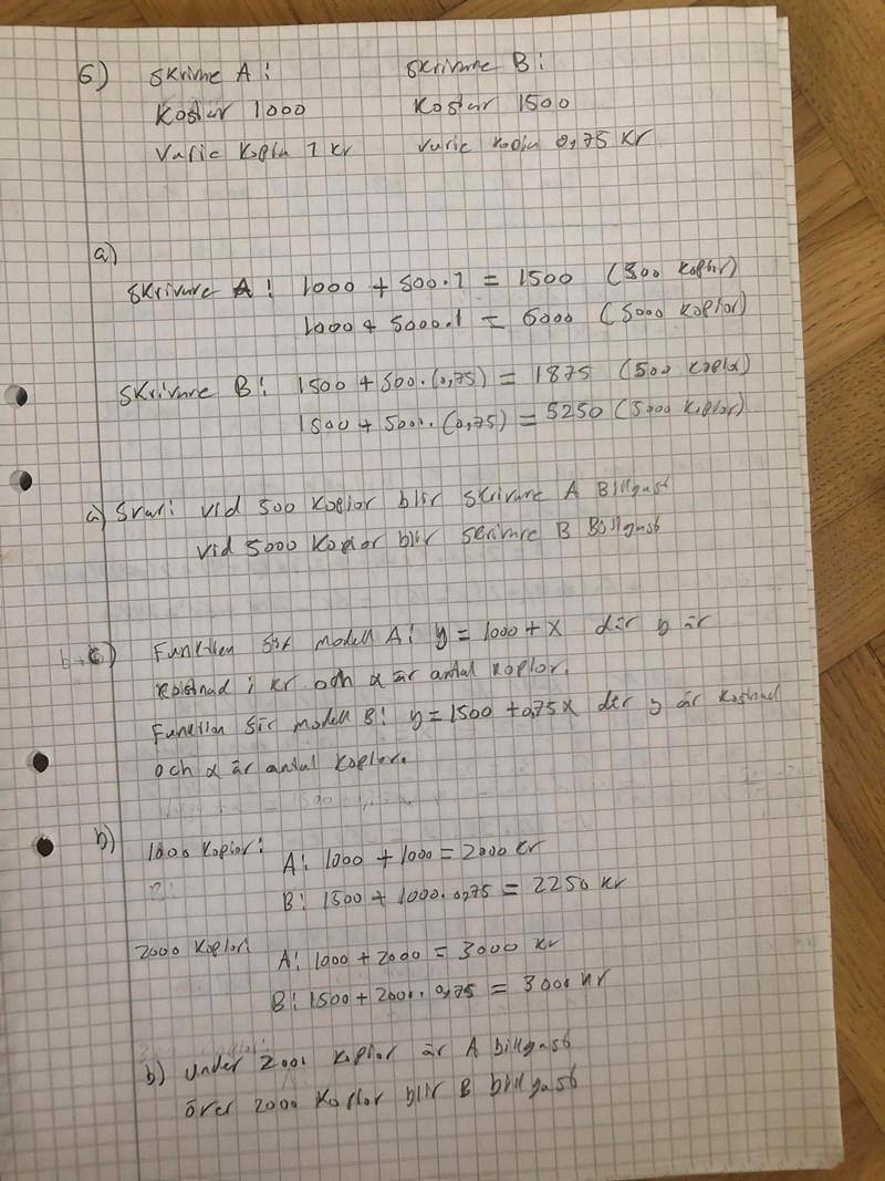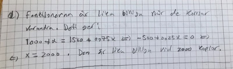 c) Ser knappt vad som står men det är rätt eftersom man kan se det i uppgift b) Att om A är mindre än B innebär det färre än 2000 kopior, alltså bör 2000 kopior innebära att det är samma pris.