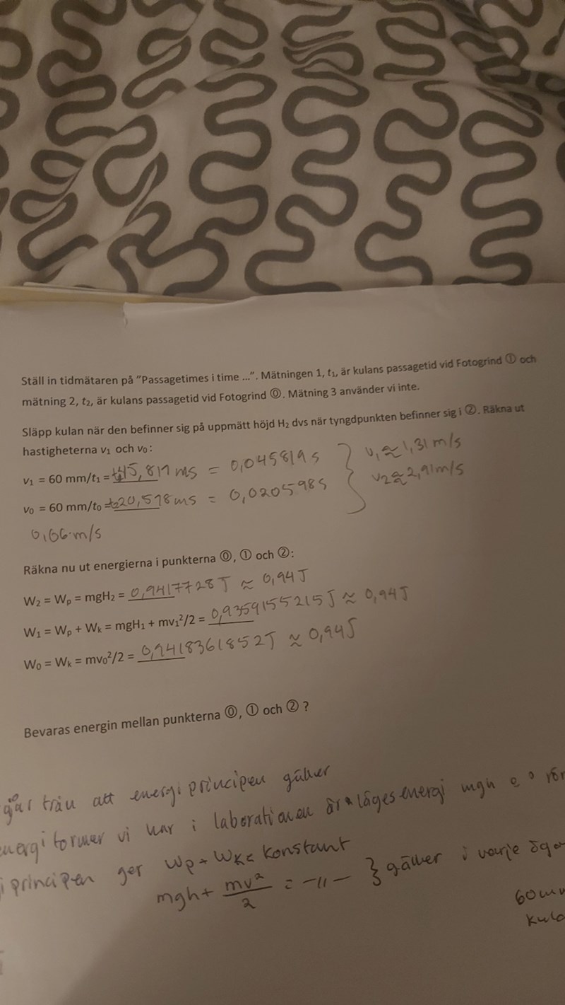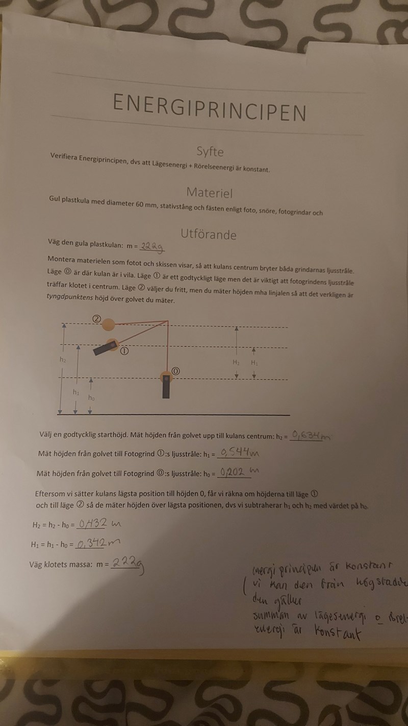 Du har ju visat att summan av energin i alla tre punkterna är densamma, 0.94J. Vad är det du inte tycker stämmer, eller har jag missuppfattat något?