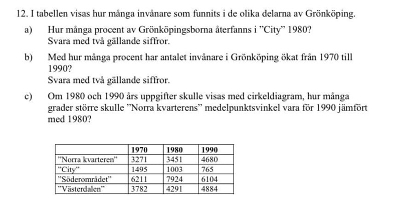 c) De ökar med 36% men det är inte vad som frågas efter! Utan det är skillnaden mellan kvarterets andel av befolkningen respektive år. Du måste alltså ta cirkelsektorns storlek för vardera året och jämföra dem - sen kan du räkna om till grader. Du skriver att ett kvarts varv är 90grader så du kan lätt räkna ut ett helt varv.