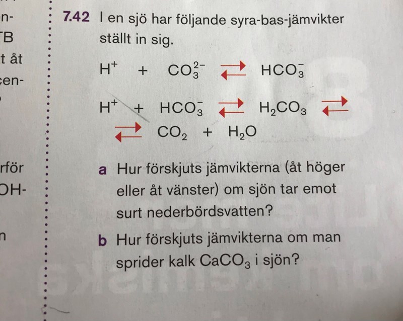 a) Jämnvikten förskjuts åt höger, eftersom vätekarbonatjoner börjar bildas i snabbare takt än det bildas oxoniumjoner. (Därför att vätekarbonatjonen liksom kolsyran är svaga syror och svaga syror protolyseras inte så mycket. Karbonatjonen däremot, som ganska stark bas, tar gärna upp protoner.)