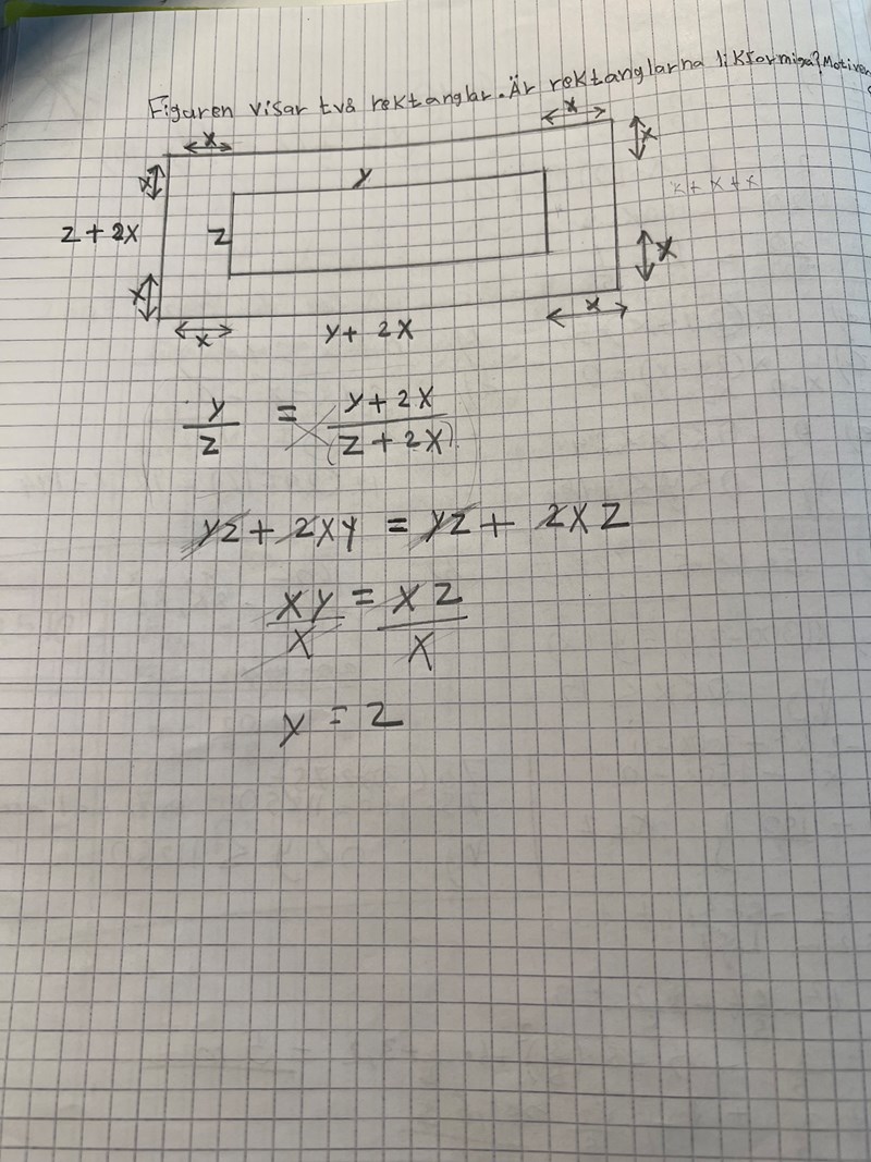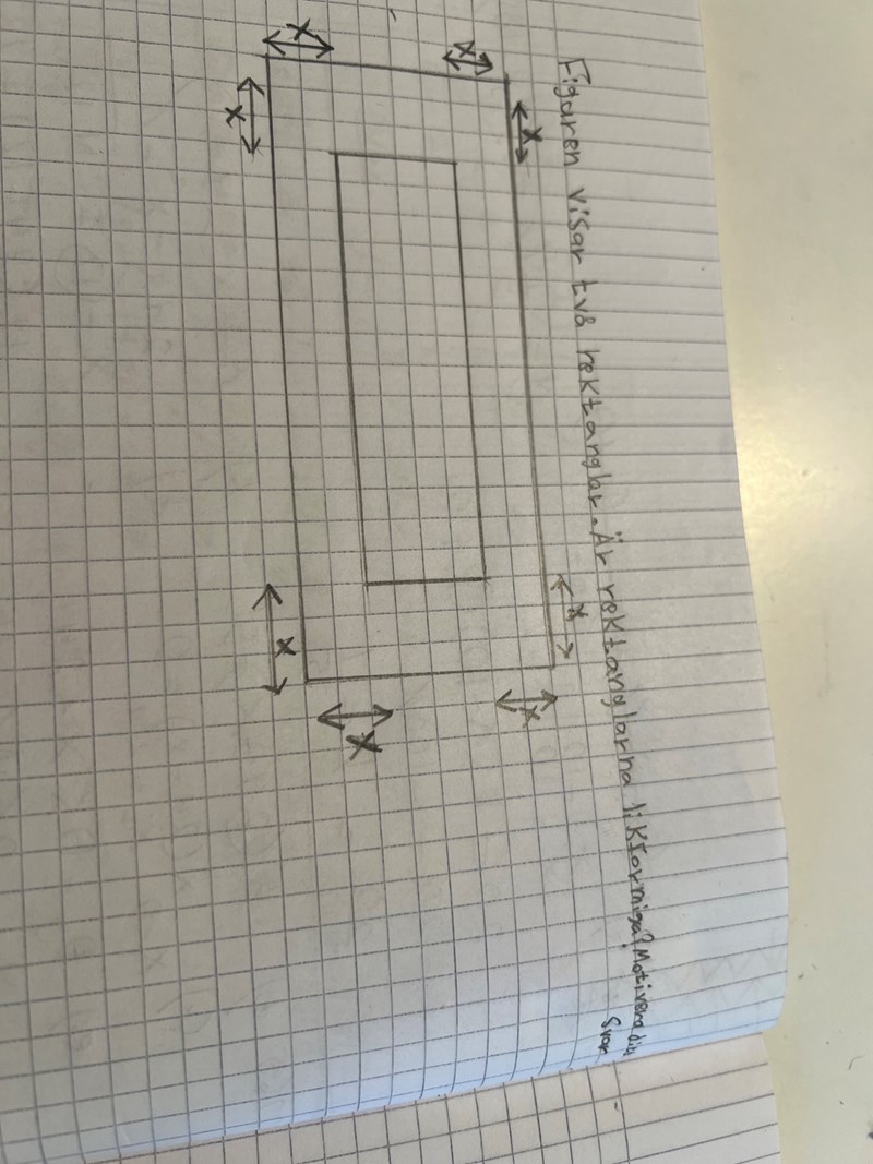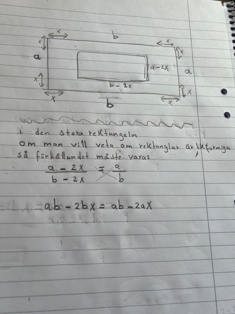 Hur som helst: Låt sidorna i den stora rektangeln vara a och b och x>0. Då är sidorna i den lilla a-2x resp b-2x. Likformighet råder om och endast om (a-2x)/(b-2x)=a/b <==> ab-2bx=ab-2ax <==> ax=bx <=> a=b då x>0 förutsätts. Alltså ej likformiga annars.