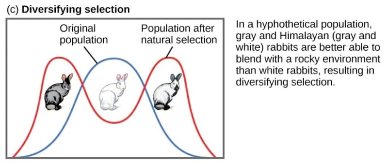 Resultatet av ett disruptivt urval kan istället för att bilda en ny art, vara begränsat till att två populationer inom samma art uppstår (t.ex. grå och gråvita kaniner, som i bilden).