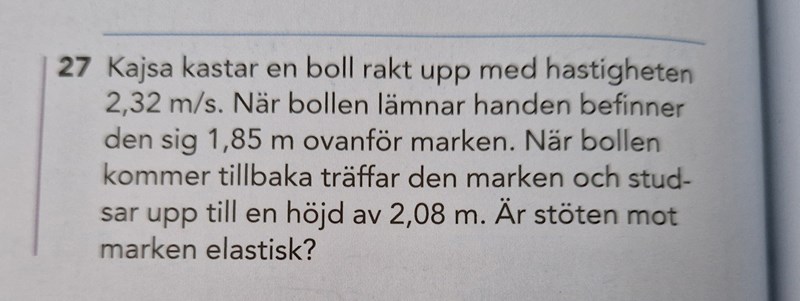 Bollen börjar med en och , vilket summerat blir en . När den studsat och når en annan höjd får den en ny som bara är potentiell energi. Det räcker att jämföra dessa utan blanda in hastigheter.