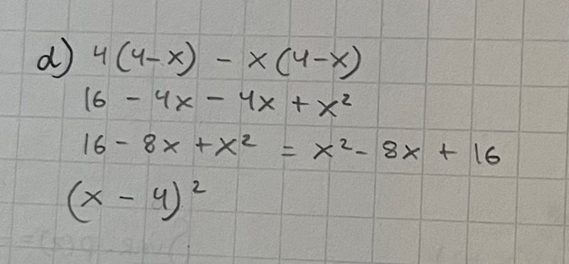 Jag har löst denna uppgift som du kan se nedan, och kommit fram till att svaret bli (x-4)2, i facit står det däremot att svaret blir (4-x)2. Jag undrar nu om mitt svar och facit svar är samma sak och har samma värde? Om nej, vad är det jag har gjort för fel?