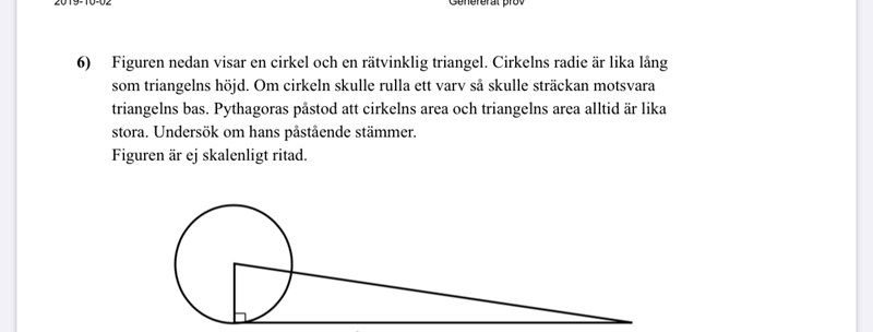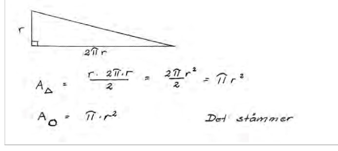 Använd fler ord. Skriv att "Triangelns bas är lika med cirkelns omkrets, alltså2pi. Triangelns are är ... Cirkelns area är...". Bra att du har ritat!