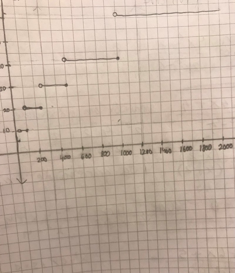 jag tänker att funktionen kommer att vara giltig för alla x i intervallet, mellan 0 gram och upp till 200 g. Men det sker även hopp i funktionen. Alltså kommer funktionen att vara varken diskret eller kontinuerlig.