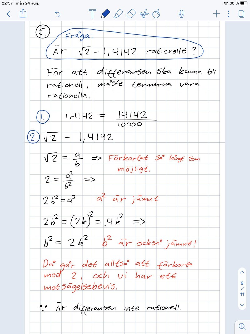 Anta att är ett rationellt tal. Då är också ett rationellt tal, eftersom en summa av två rationella tal är ett rationellt tal. Men då är ett rationellt tal, vilket du vet inte är fallet. Det var därför fel att anta att var ett rationellt tal.