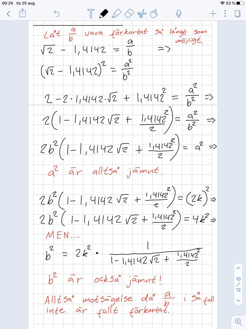 Det jag försökte illustrera med mitt exempel var att du faktoriserade ut 2 och fick något som kanske inte var ett heltal i parentesen. Jag antar att du försökte använda idén när man visade att sqrt(2) är irrationell, men detta är faktiskt mycket enklare. Antag att sqrt(2)-14142/10000=p/q, vad händer då om man får sqrt(2) ensamt på en sida av likheten?
