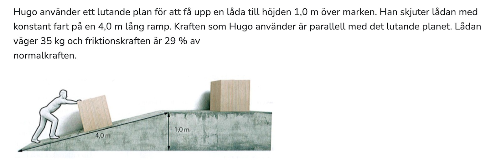 Laguna skrev:Då håller jag med (men man måste säga åt vilket håll x är). F i den formeln är den totala kraften längs det lutande planet, så vi kan använda den för att beräkna Wtot, men de har tagit friktionskraften och tyngdkraften helt separat här, det går lika bra. Tyngdkraftens bidrag räknas då med hela kraften (vertikalt) men med höjdskillnaden h och inte den förflyttade sträckan.
