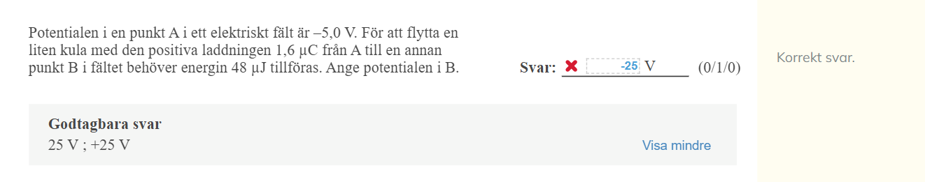 Jag undrar varför potentialen inte blir negativ i detta fall. Om arbetet som behöver utföras är 48 mikrojoule bör laddningen röra sig i fältets riktning (eftersom då utför fältet ett positivt arbete på laddningen). Alltså bör laddningen gå mot en lägre potential (fältlinjerna rör sig från + --> -). Men facit säger 25 volt. Varför?