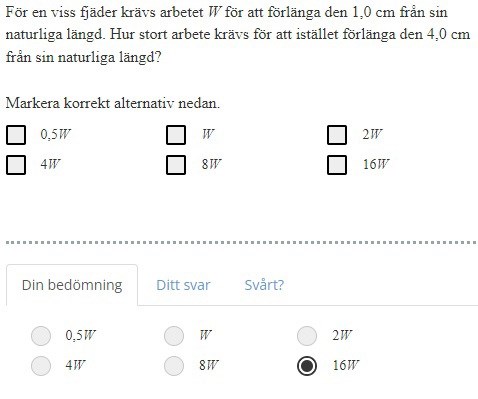 Eftersom kraften ökar proportionellt med förlängningen tar vi medelkraften som behövs för att förlänga fjädern som är (0+kx)/2 och sätter in i formeln för arbete och får då
