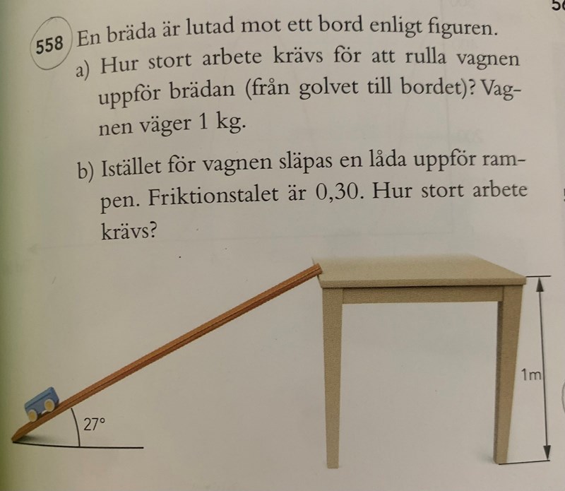 ThomasN skrev:Att övervinna friktionen kräver ett arbete som är kraften längs med brädan gånger sträckan.