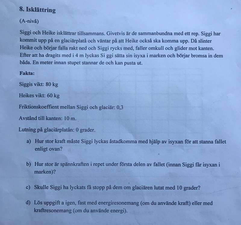 Hej, har några funderingar kring dessa frågor: varför kan man i a) uppgiften inte anta att resultanten ska vara 0.Den behöver ju vara 0 för att dem ska stå stilla. I c) uppgiften får jag att han borde lyckas då jag får att den bromsande kraften som krävs är 182,6N (svaret är dock att han inte lyckats). I c) tänkte jag att den framåtdrivande kraften blev 139N (komposant till gravitationen) sedan tänkte jag att normalkraften blev 788N och således blev den bromsande kraften 236,4N. Jag tänkte sedan att resultanten skulle vara densamma som i upg a), vilket var 280N jag satte därefter in värden och fick att den bromsande kraften behövde vara 182,6N.