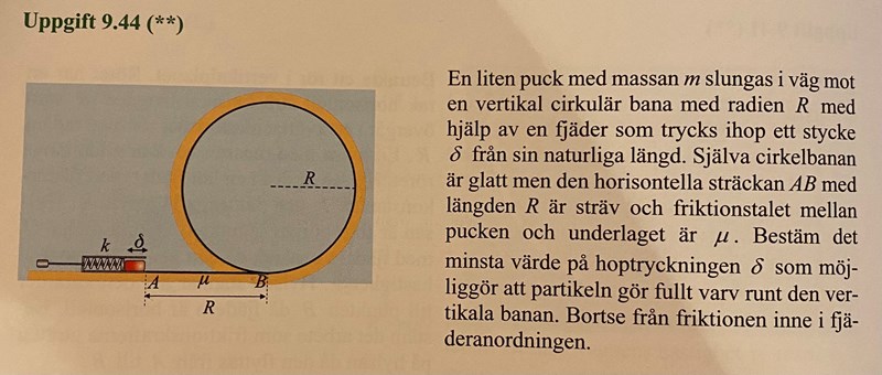 Tänker att för att pucken precis ska klara hela varvet måste normalkraften vara lika med 0 högst uppe och accelerationen vara g.