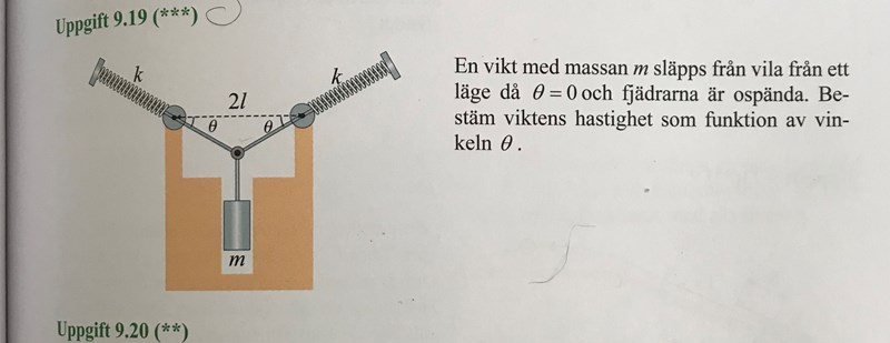 Jag vet att jag ska räkna ut det sammanlagda arbetet av tyngdkraften och fjädrarna. Jag har fått tyngdkraftens arbete som U=mgl*tan(theta), men har problem med att räkna ut arbetet för fjädrarna. Jag får att ihoptryckningen av fjädern är l/cos(theta) - l och att fjäderns kraft i y-led motsvarar kl*(1/cos(theta)-1) * sin(theta) men jag får inte något vettigt utav det när jag integrerar. Någon som har något tips hur jag ska gå vidare?