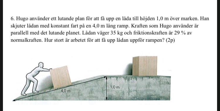 när jag räknar ut frikosarbetet + mgh för lådan blir det rätt men det jag gjorde var att jag räknade friktionsarbetet + total kraft gånger sträcka dvs friktionskraften och tyngdkomposanten gånger sträckan vilket gör att jag räknar med friktionskraften två gånger