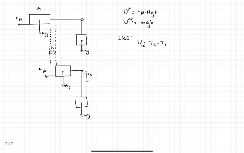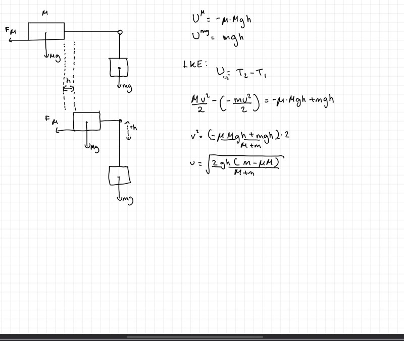 Det jag har gjort är då att få uttrycket för arbetet "U" för. U^my är då arbetet för den stora massan M och U^mg är arbetet för den lilla massan m. Därefter tillämpar jag LKE "lagen om kinetiska energi" och få att kinetisk energi 1 minus kinetiskt energi 2. Sen sätter jag bara skillnaden mellan kinetiska energierna lika med arbetet från både massan M och massa m. Men det jag inte förstår är varför min (mv^2/2) är minus?