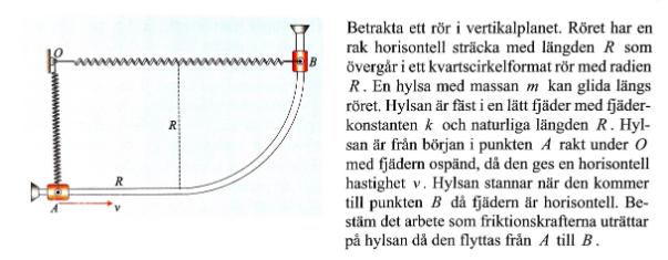 Jag tänker att man skulle kunna ta fram hylsans potentiella energin pga. höjd vid A och B, där hB = R och hA = 0. Sedan tar fram potentiella fjäderenergin Vfj =1/2 kR^2. Sedan ställa upp ekvationen "på något sätt".