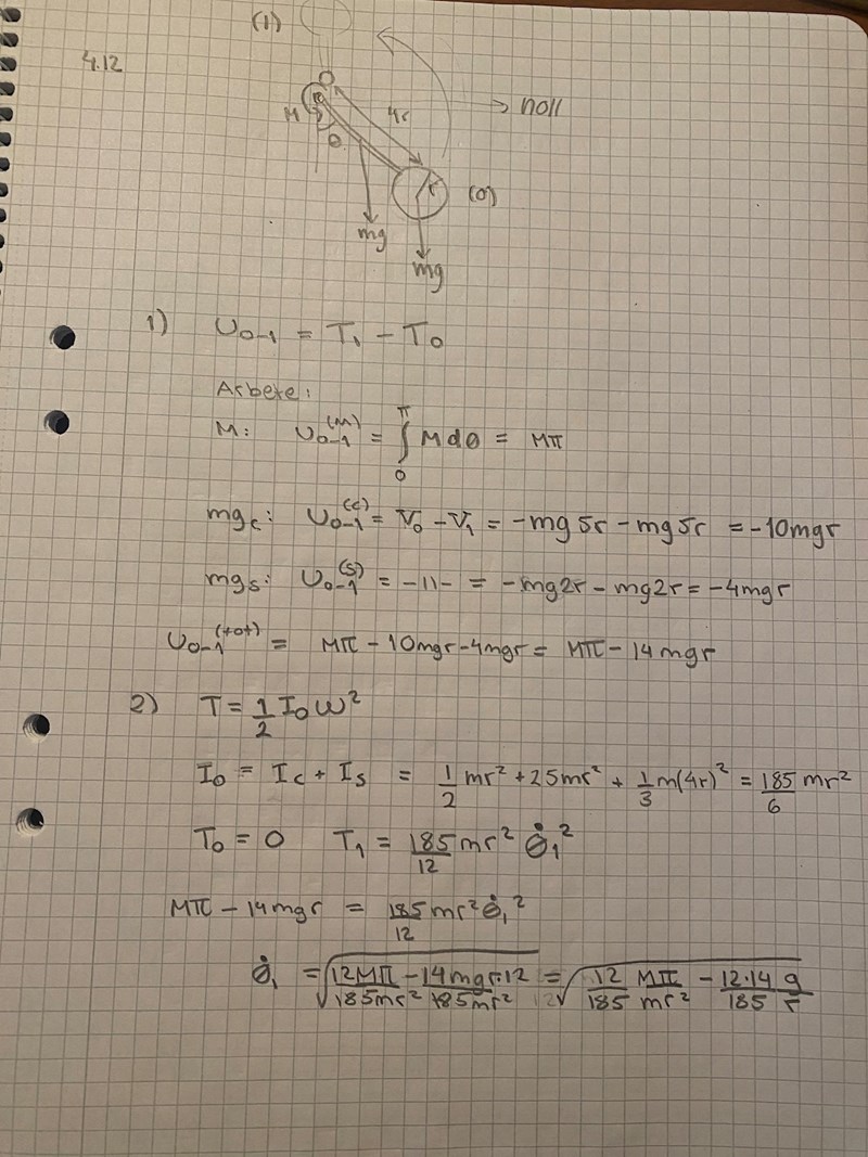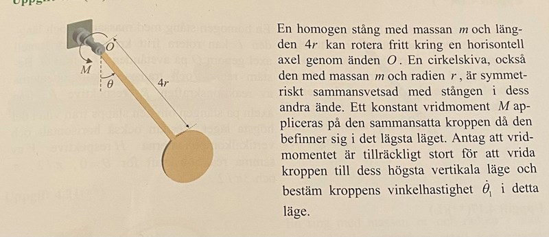 Det är väl enklare att räkna ut arbetet mha potentiell energi än att ställa upp ett uttryck för momentet som funktion av vinkeln och sedan integrera. Men testa med integration och se om du kan få samma.