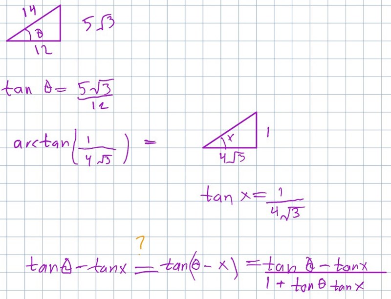 Lösningsiden är att bestämma trigonomentriska uttryck för de två vinklarna för att sedan använda summationsformeln för exvis tan, och efter förenkling få fram ett uttryck som vi känner igen som en standardvinkel.