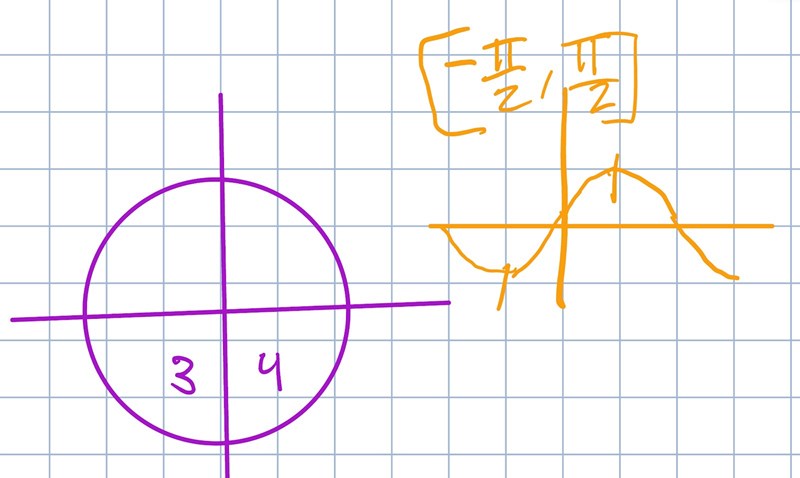 Tack för snabbt svar. Jag tittar i enhetscirkeln och kommer fram till att negativa värden för sinus får man i kvadranten tre och fyra. Där efter kollar jag för vilka värden på sinus som Arc-sinus är definierad enligt min skiss. Sedan försöker jag tänka vad jag ger för konsekvenser till Arc-sinusfunktionen i. Jag tänker mig att om vi befinner oss i den tredje kvadranten måste jag byta till motsvarande värde i fjärde kvadranten och Dock vet jag inte riktigt hur jag ska gå vidare härifrån.