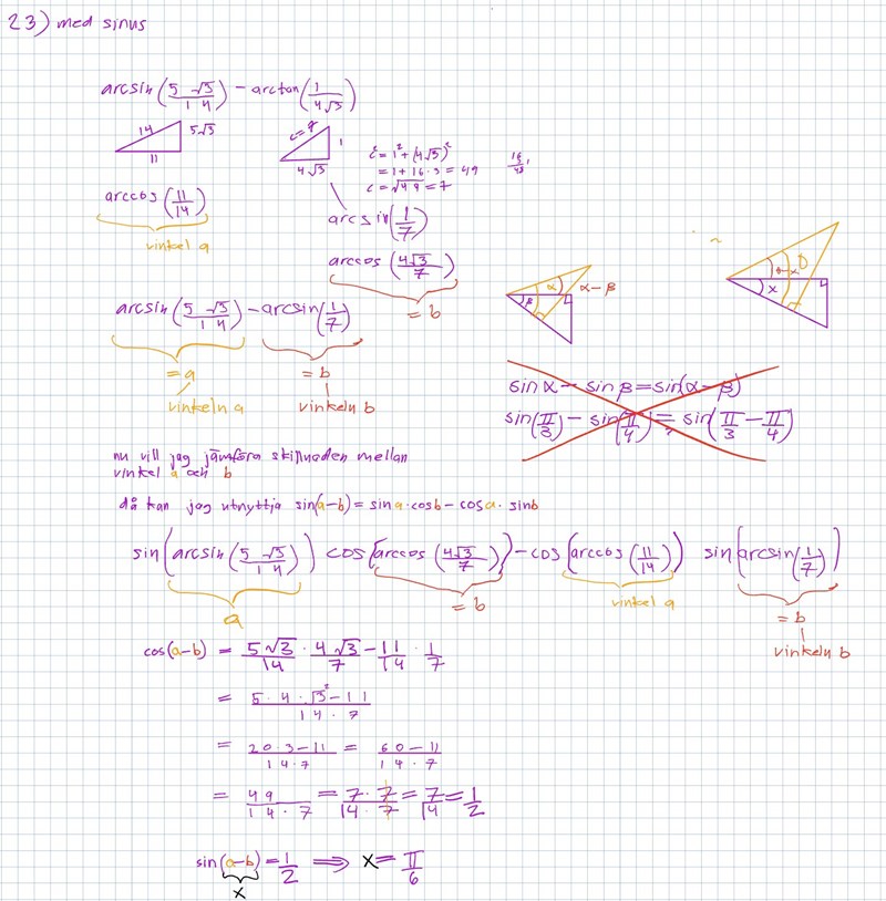 sådana att a = arctan(5*../11) och b = arctan(1/(4..)) (arctan funktionen ger en vinkel som resultat)Man frågar efter skillnaden av dessa två vinklar, vilket vi inte kan räkna ut direkt, utan hjälp av digitala hjälpmedel.