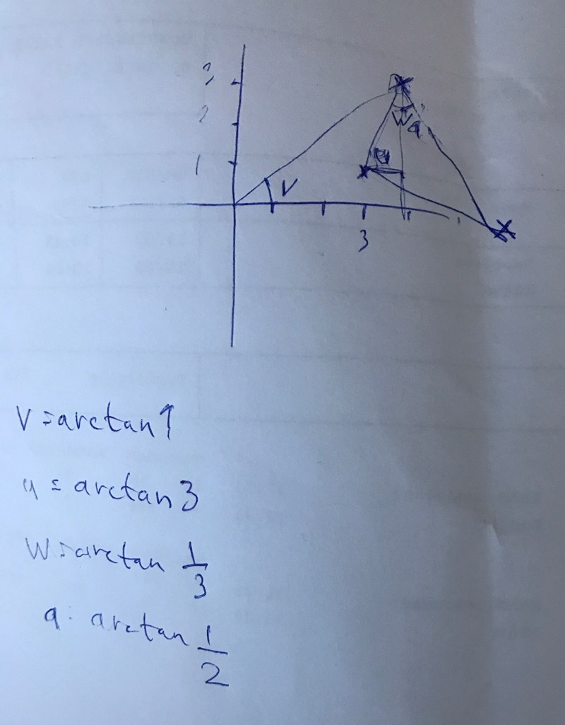 Kanske inte den elegantaste bilden, men tror man kan komma fram till att vinkelsumman är medelst den.