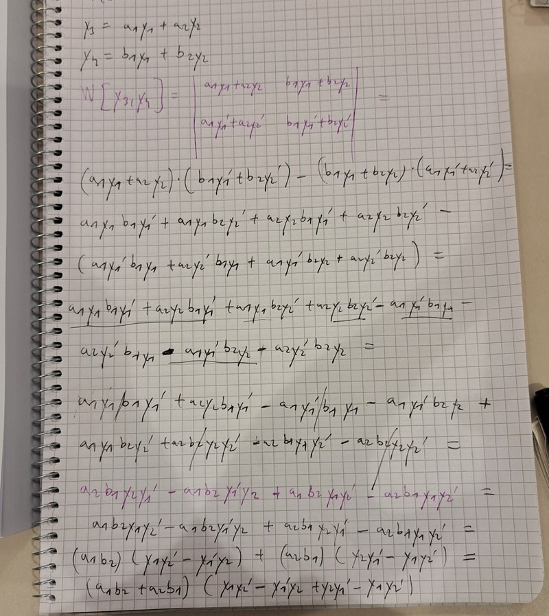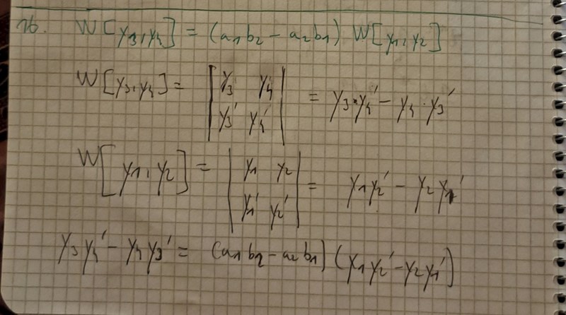 Du kan använda räknereglerna för determinanten för att hitta sambandet mellan wronskianen för y3 och y4 på ena sidan och wronskianen för y1 och y2 på andra sidan då du vet att respektive är linjärkombinationer av och .