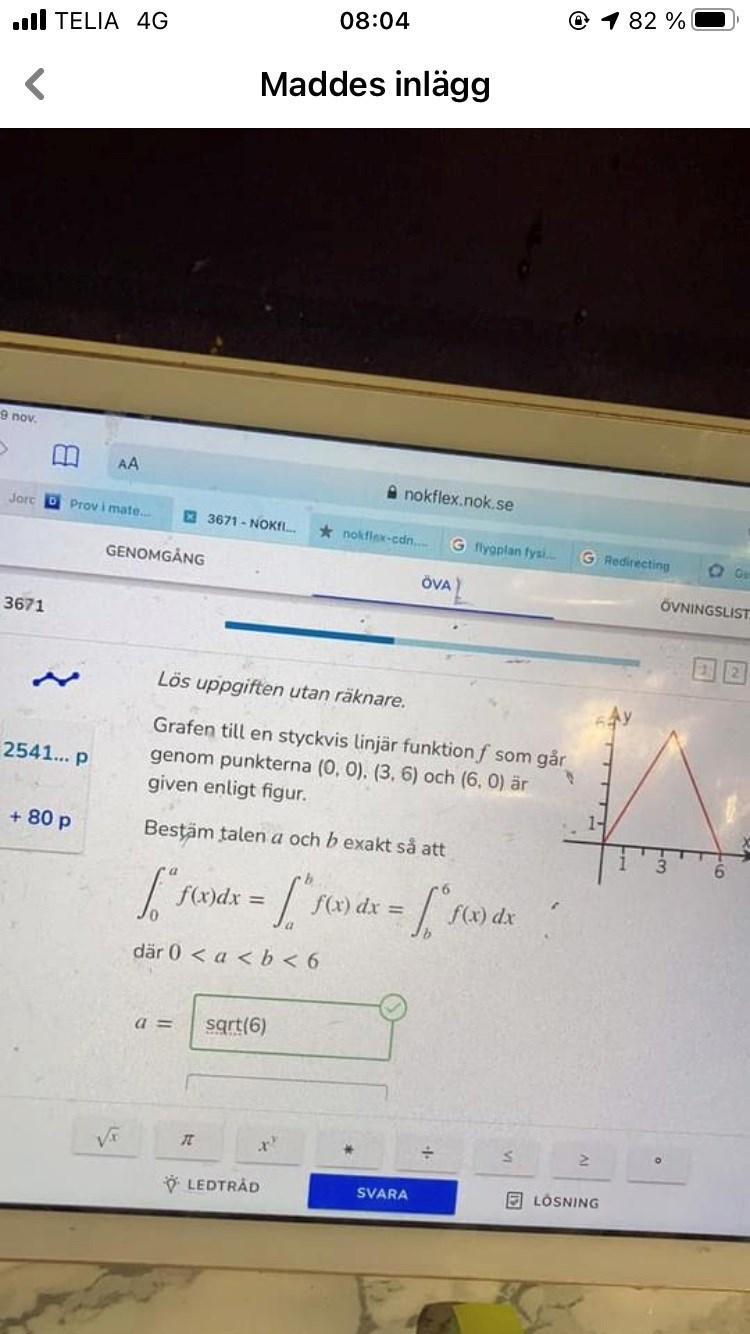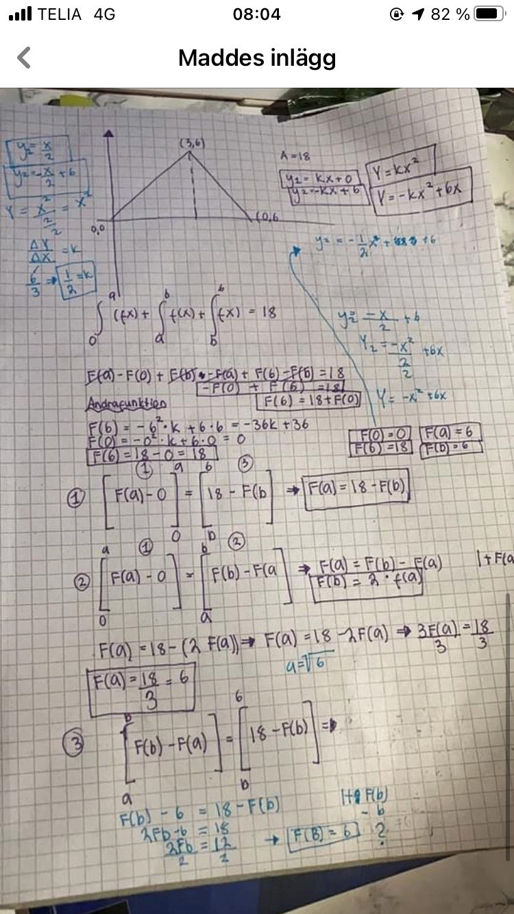 Hej! Jag sitter verkligen fast på denna uppgift. För den ena linjens ekvation blir y1= 2x enligt dy/dx. Skärningen blir ju 0. Och kommer därmed fram till att F(a) = 6