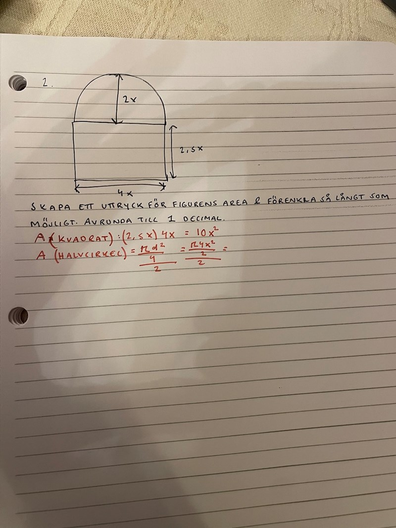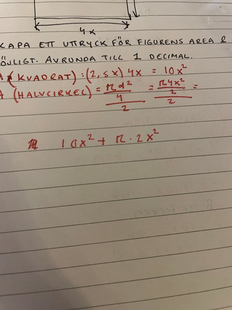 Det betyder att halvcirkelns area är A = pi•r2/2 = pi•(2x)2/2 = pi•2x2.