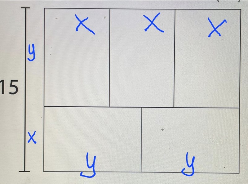 Om varje rektangel har måtten x på ena hållet och y på andra hållet så har den sammansatta rektangeln måtten 3x på ena hållet (horisontellt) och x+y på andra hållet (vertikalt), se bild.
