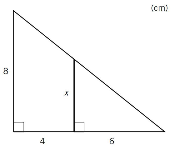 Den lilla triangeln har sidlängderna x och 6 utsatta i bilden. x är lodrät och 6 är vågrät. Den stora triangeln har en lodrät sida som är 8. Men hur lång är den vågräta sidan? Du räknar som om den är 4, men det är den inte. Titta i bilden igen!