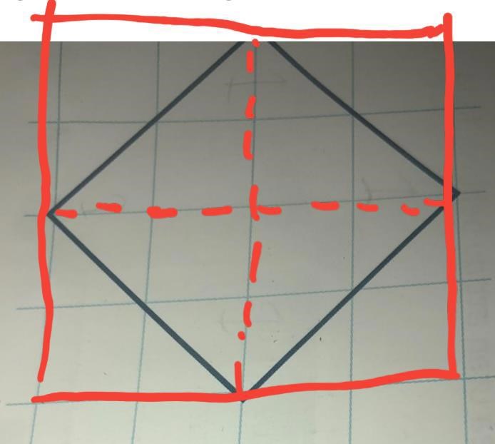 - Den översta romben är precis hälften så stor som den röda heldragna kvadraten (se bild)