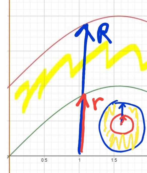 Aha okej, men varför har det tidigare gått att man bara tar den övre funktionen minus den undre för att beräkna den "nya" funktionen eller radien.