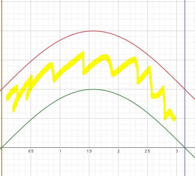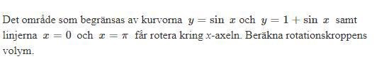 Jag har ritat upp dom båda kurvorna i en graf den area segment som jag anser ska rotera blir och gör att volymen blir . Varför funkar inte det?