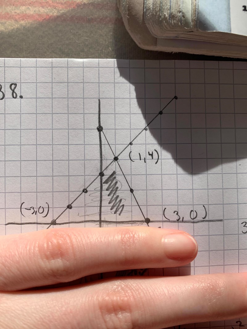 Nu finns det två sätt som är fördelaktiga att använda. Om ni har lärt er Picks sats så är det ett utmärkt tillfälle att använda den. Om inte så räkna ut arean på den stora triangeln och ta bort området som inte tillhör den sökta arean eller dela upp den sökta arean i polygoner som du vet hur du beräknar arean på.