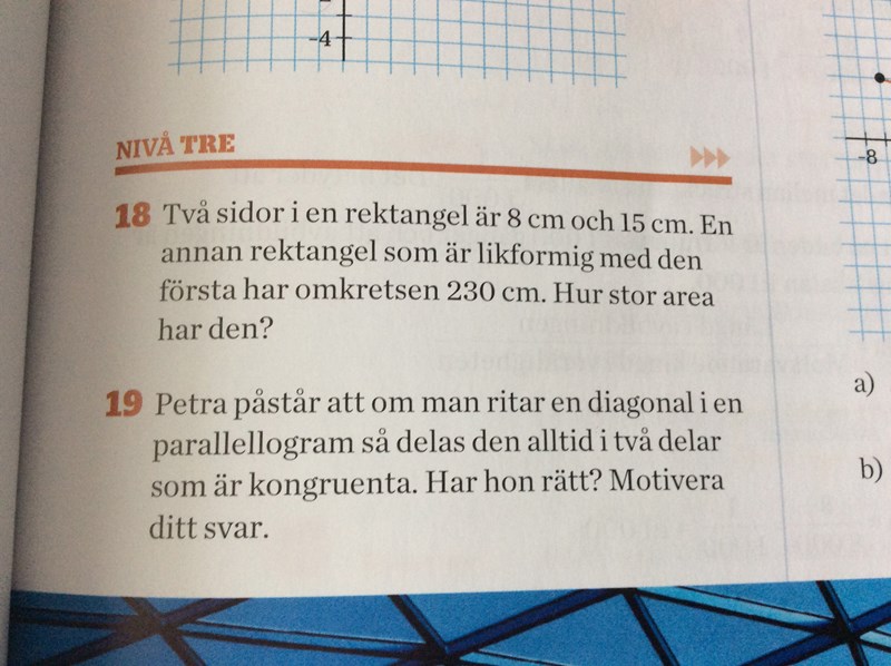 Hej, jag behöver hjälp med uppgift 18. Jag vet inte hur jag ska räkna men jag har testa såhär: jag dela omkretsen på 4 så att jag fick ungefärliga mått på varje sida. Sedan multiplicerade jag b•h och då fick jag 3306,25 som jag avrunda till 3000 cm2 vilket är rätt svar. Men jag är osäker på min beräkning och den känns inte rätt då jag beräknat det här som om det vore en kvadrat.