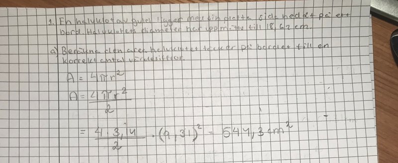 Du har räknat ut arean som inte är vänd mot bordet. Det är ju en cirkelskiva som står i kontakt med bordsytan, inte den välvda delen av halvklotet.