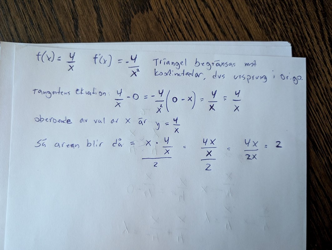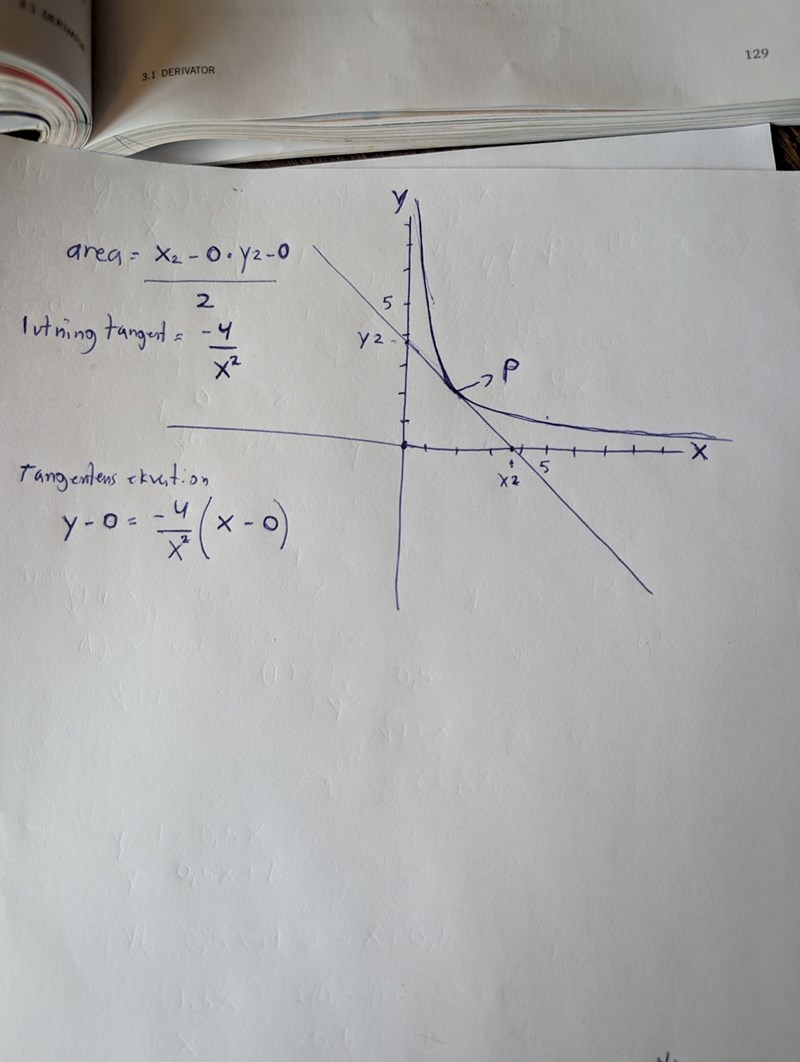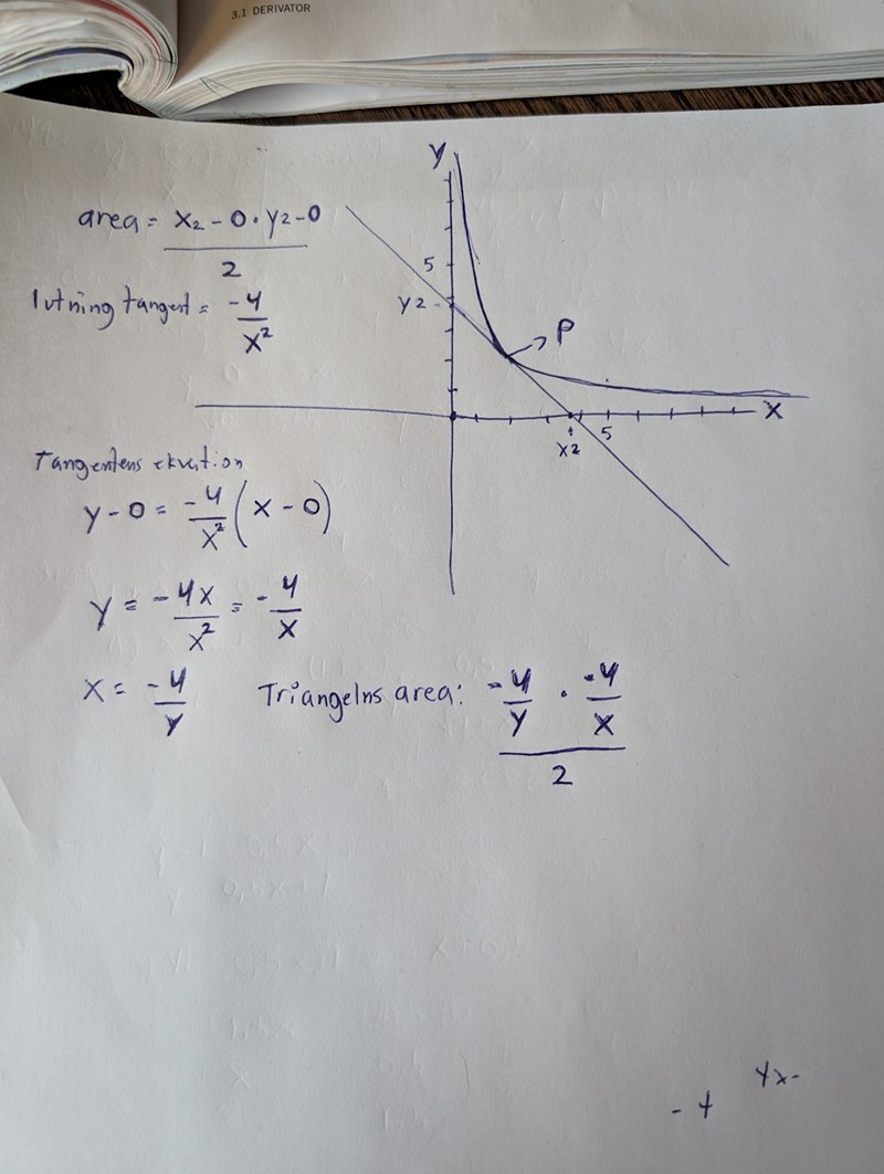 Om P = (a, 4/a) blir tangentens ekvation y = - 4x/a2 + m,