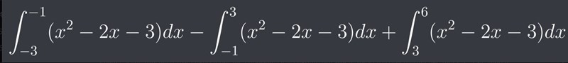 Hej! Jag skulle behöva lite hjälp med att förstå den här uppgiften nedan. Uppgiften lyder så här: "Beräkna arean av det ändliga områden som begränsas av parabeln y=x^2 och kurvan y=2x+3, x=-3 och x=6". Jag tog reda på skärpunkterna och de är x=-1 och x=3. Frågan som uppstår är att varför är den sista integralen "+" istället för minus? Jag förstår de två första integralen men inte den sista. När jag tog alla integralerna minus varandra så fick jag fel svar men när jag tog plus på den sista blev det korrekt. Varför det? Tack på förhand!