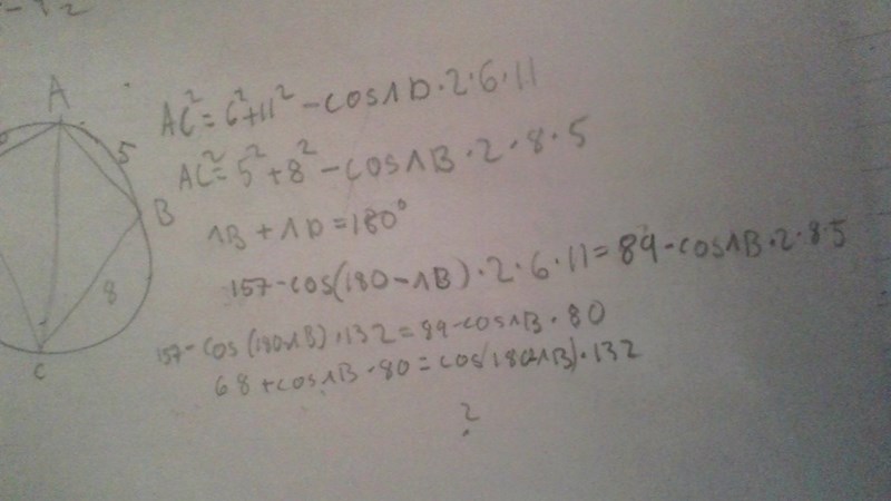 En fyrhörning med sidorna 5, 6, 8 och 11 skrivs in i en cirkel. Beräkna fyrhörningens area. jag förstår verkligen inte hur man ska göra det här... jag antar att man ska dela upp fyrkanten i olika trianglar, men jag förstår inte hur.... origo 6255