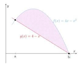 Jag hänger inte med. Jag tänker mig att jag roterar och flyttar koordinatsystemet så att linjen hamnar på den horisontella axeln. Då är ju den sökta arean området ovanför den horisontella axeln, men detta avgränsas till vänster av en kurva som inte är en funktion, eller?