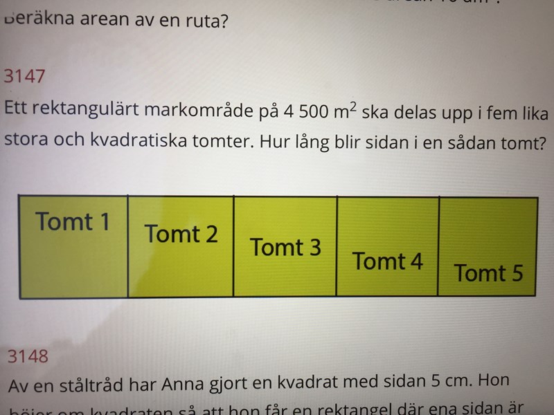 Jag vet inte direkt om de menar att arean är 4500 kvadratmeter eller om det är rektangelns sida. Men borde man inte dela 4500 med antalet kvadrater dvs 5.
