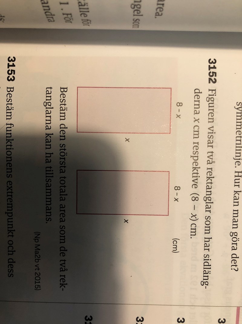 Hur ska jag tänka här? Jag kommer inte längre än x(8-x+8-x) och sedan förenkla det om man vill lägga ihop de bredvid varandra som de står. Men hur ska jag veta vad som ger maximal area?