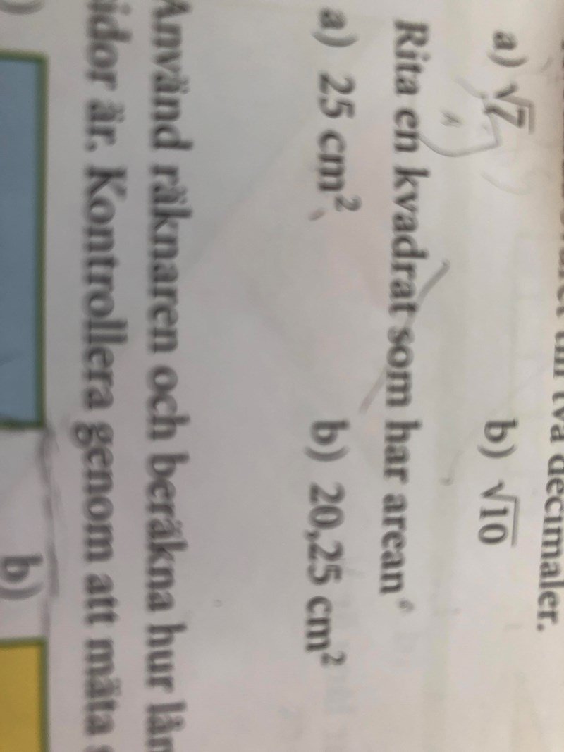 På uppgift b så har jag en uppgift där jag ska rita en area på en kvadrat dom har arean 20,25. Jag vet inte hur jag ska ta mig till väga eller hur jag dka lösa uppgiften när arean innehåller decimaler! Så kan någon förklara hur jag ska göra? Jag har testat mig fram Men får inte rätt svar.