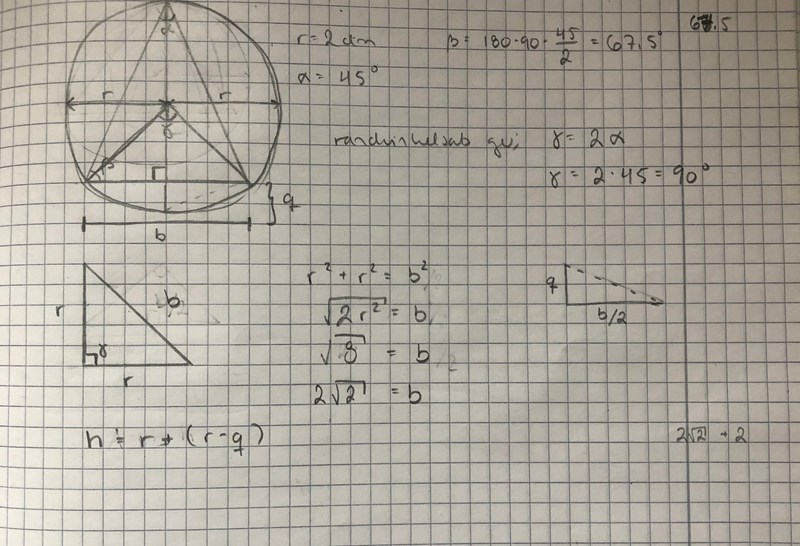 jag försöker lösa denna upg: "En likbent triangel är inskriven i en cirkel med radie 2 dm så att vinkeln mellan de lika sidorna är 45 grader. Beräkna triangelns area".