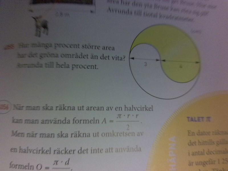 Jag har försökt lösa den genom att räkna ut arean på cirklarna där diametrarna står. Då får jag 1,5²·π= 7 cm² på den vita. 2²·π≈ 12,566 cm².