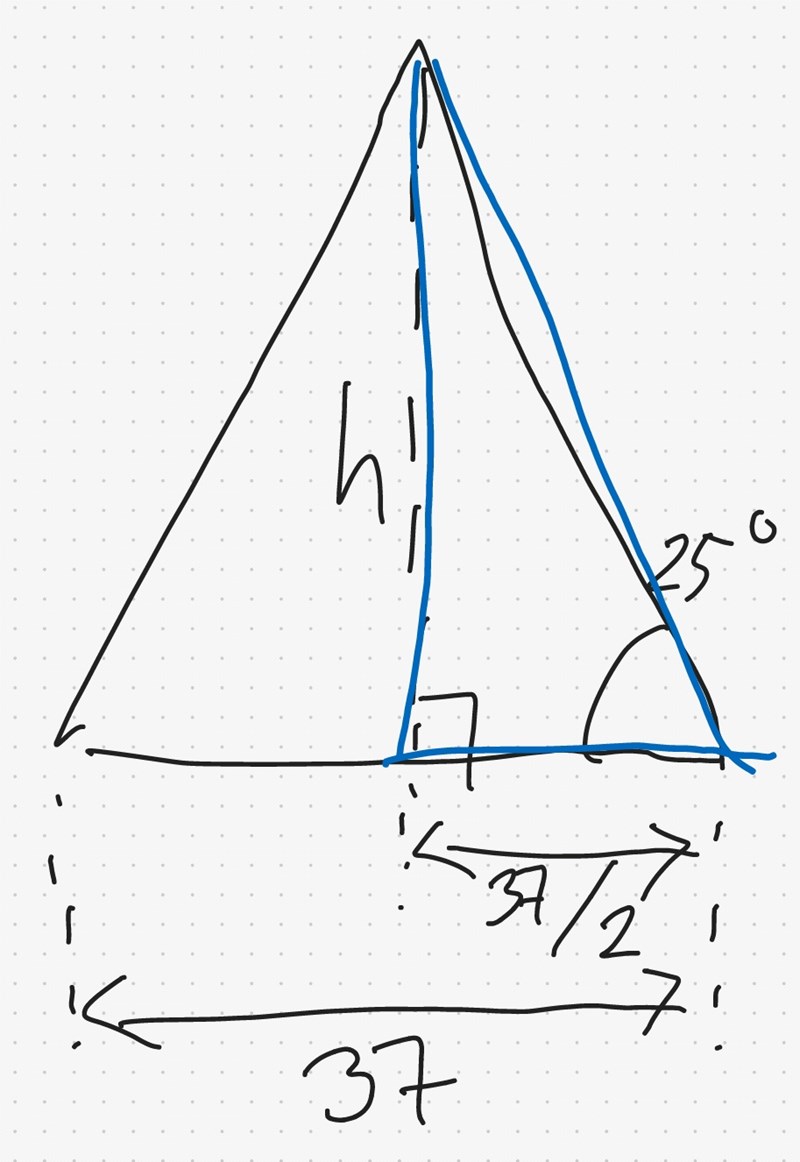 I en likbent triangel är dem lika stora vinklarna vardera 25 grader. Längden av mellanliggande sida är 37cm. Bestäm triangels area.