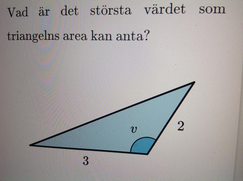 larsolof skrev :Tänk dig att du kan "vrida" kanten som är 2 l.e. åt höger så vinkeln v blir större och större.