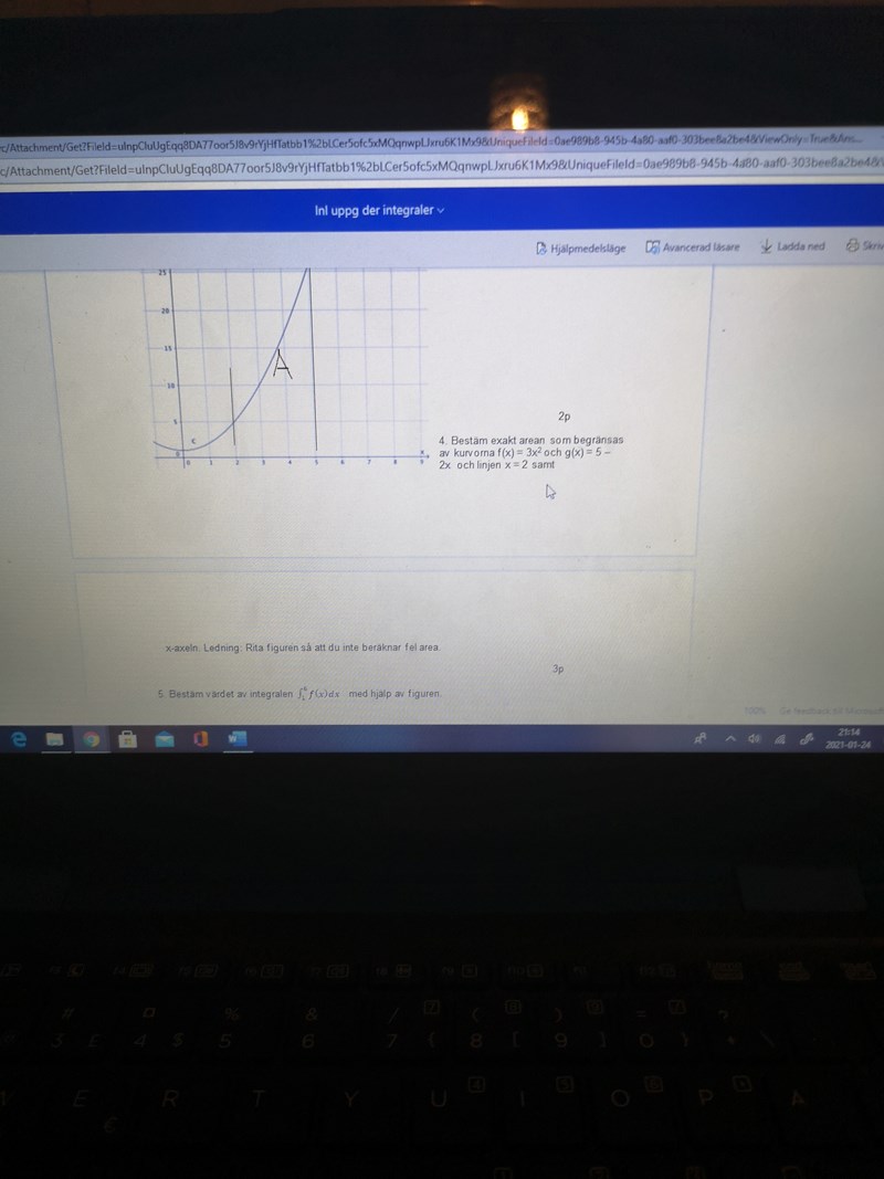 Jag ställde först upp ekv 3x'2=5-2x för o veta när linjerna skär varandra då fick jag ut 2 svar med hjälp av pq där 1 utav de möjliga lösningarna stämde x=1. Sen så gjorde jag en ny formell till de kurvorna genom att subtrahera f(x) med g(x) sedan så integrera jag formeln o beräkna arean genom att sätta in x=2 o subtrahera med x=1 men jag fick ut ett helt fel svar...